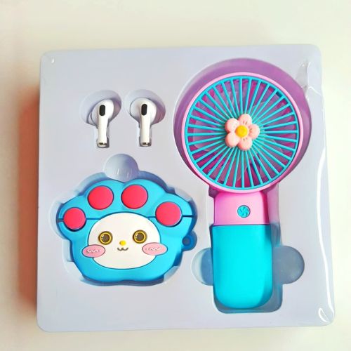 This compact and trendy set includes a portable mini fan, TWS wireless earbuds, and an attractive cartoon design case, which will make your daily use easier and more enjoyable.